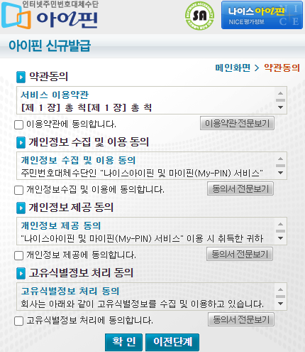 5. 아이핀 신규 발급 약관 동의 체크 후 확인 클릭
