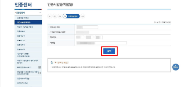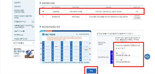 5. 인증서 종류를 선택하고 시크릿 카드 발행번호 및 번호를