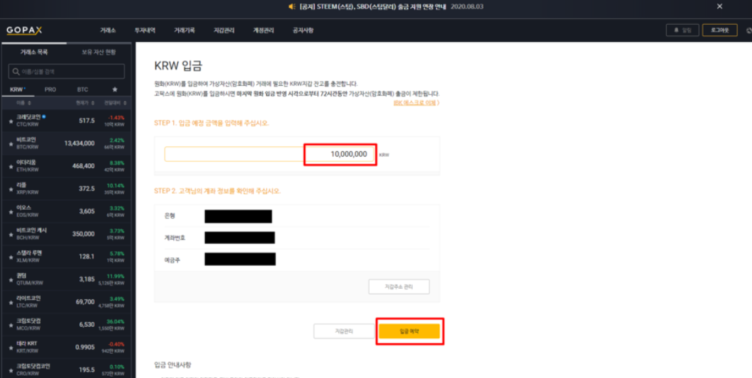 입금 단계가 끝났으면 들어온 금액으로 비트코인을 사거나