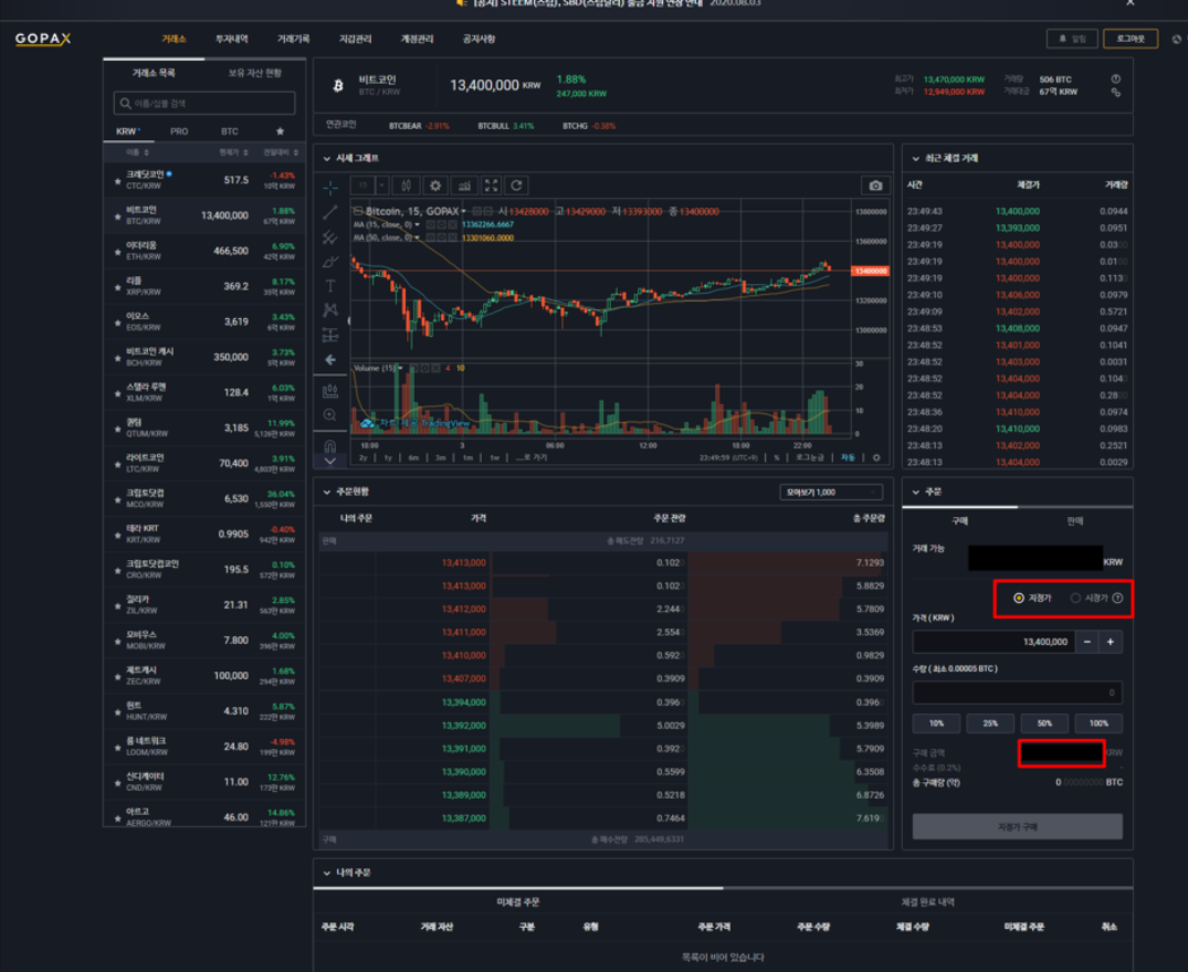 거래화면에서 지정가 또는 시장가를 선택한 후 구매나 판매를 진행하면