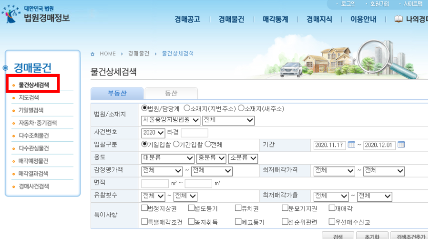 대법원 경매물건 > 물건 상세검색 하기