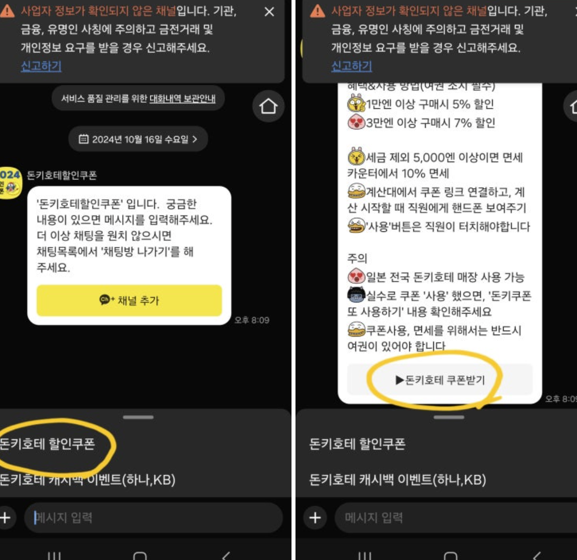 해당 메세지 하단에 [▶돈키호테 쿠폰받기]를 클릭해주세요!