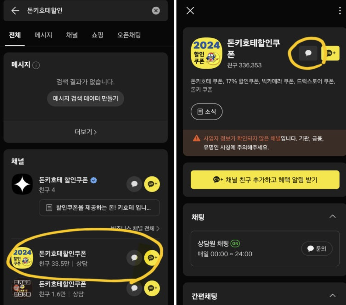 1. 카카오톡에 "돈키호테할인쿠폰"이라고 검색하시면 위 프로필이 확인되실 거에요