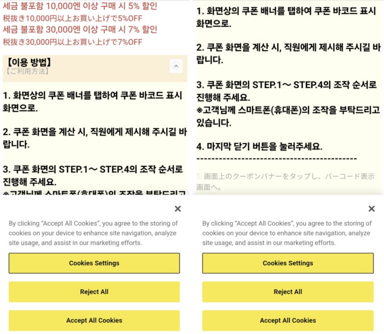10,000엔 이상 구매하시는 분들은 위 은색 쿠폰을,