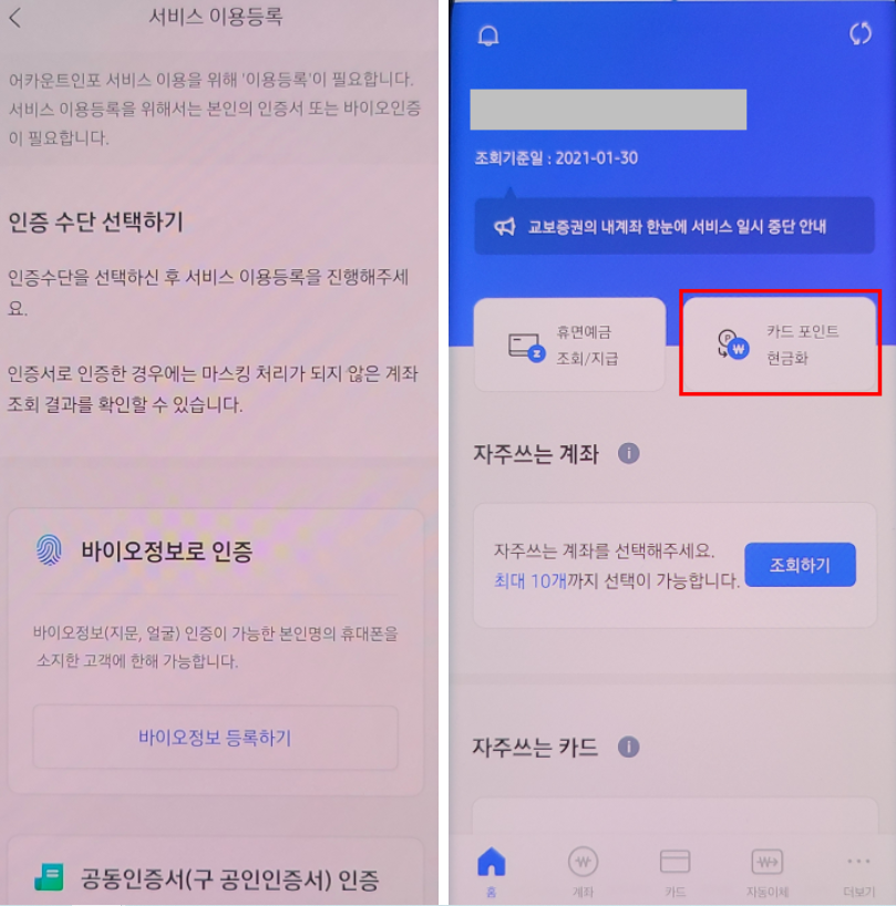 이번에 카드 포인트 현금 전환 서비스가 가능하도록 업그레이드가